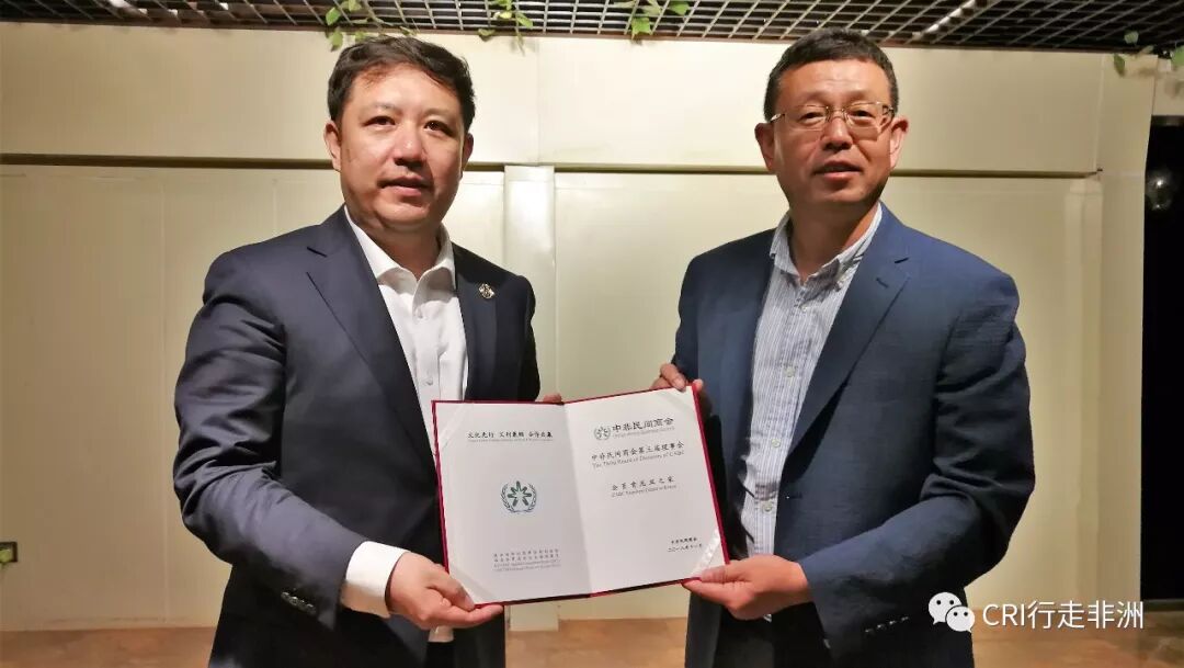 中非民间商会秘书长王江(左)向肯中旅负责人