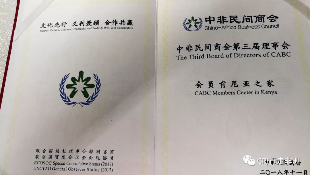本月12日,应中非民间商会(China-Africa Business Council)的邀请,肯尼亚中国旅行社(简称“肯中旅”)负责人张远翔等出席了中非商会第三届理事会“非洲之家”授权仪式,“肯中旅”也因此成为中非民间商会在非洲的第四家“非洲之家”。