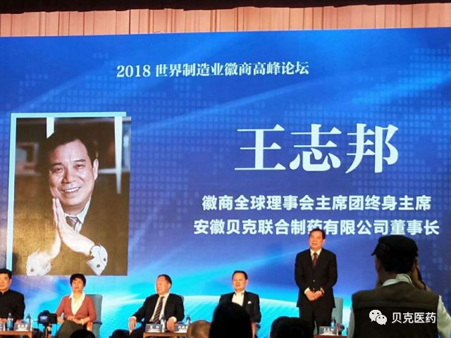 徽商全球理事会主席团终身主席、安徽贝克联合制药有限公司董事长王志邦先生,作为特约嘉宾参加了2018世界制造业徽商高峰论坛,一展徽商生物医药领军人物的风采。